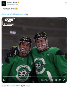 To what extent Hintz is deployed tonight will be interesting to see, as Hintz practiced on the second power play unit this morning (Bourque, Stankoven, Harley, and Dadonov), with Matt Duchene continuing to get reps in Hintz’s old spot with Benn, Johnston, Heiskanen, and Robertson. That may just be a result of Hintz’s not having practiced with his old power play group, and given their recent success (three power play goes in their last two games), you could see DeBoer being reluctant to throw Hintz back up there right away, lest burgeoning chemistry be disrupted. (I just wrote that sentence because I wanted to say “burgeoning.”)