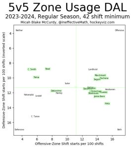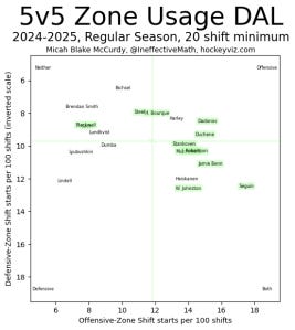 Last year, Lundkvist was heavily protected, starting averaging nearly 14 offensive zone starts for every 9 defensive zone starts. This year, he’s almost exactly even, averaging about 9 OZ/9 DZ, as you can see above. All the offensive zone starts the Stars can spare are being given to Harley and Heiskanen, who profiles as the ones most likely to capitalize on them. That’s preferable to using offensive zone starts for players the coaches don’t trust in the defensive zone, as seemed to be the case at times last year with Lundkvist.