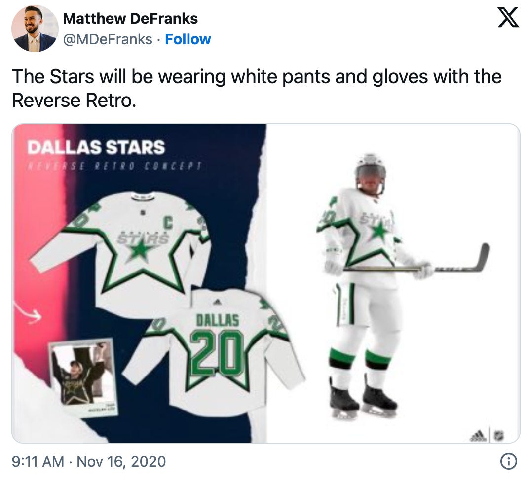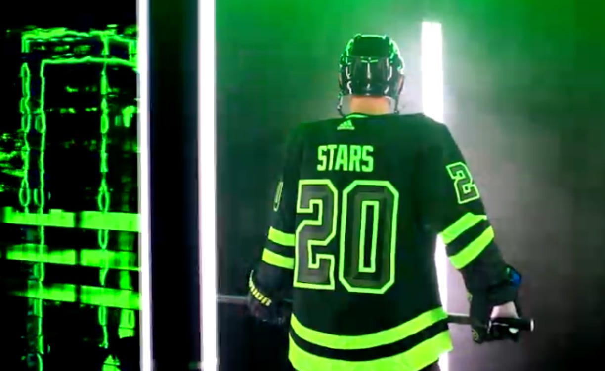 On a less sartorial level, the team was pretty bad in 2020-21, missing the playoffs in a season that is best forgotten by everyone except the Montreal Canadiens3. That probably didn’t help the monochromatic look win anyone over, either. In contrast, the 2022 Reverse Retros debuted when the Stars began tearing up the Central Division, with Jason Robertson in particular setting Dallas scoring records that year. Good memories beget fond ones, after all.