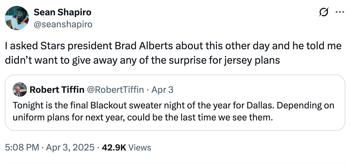 As for what’s next, I keep coming back to two things about future Dallas Stars sweaters that just seem inevitable. One of them is speculative, and one is more deductive.