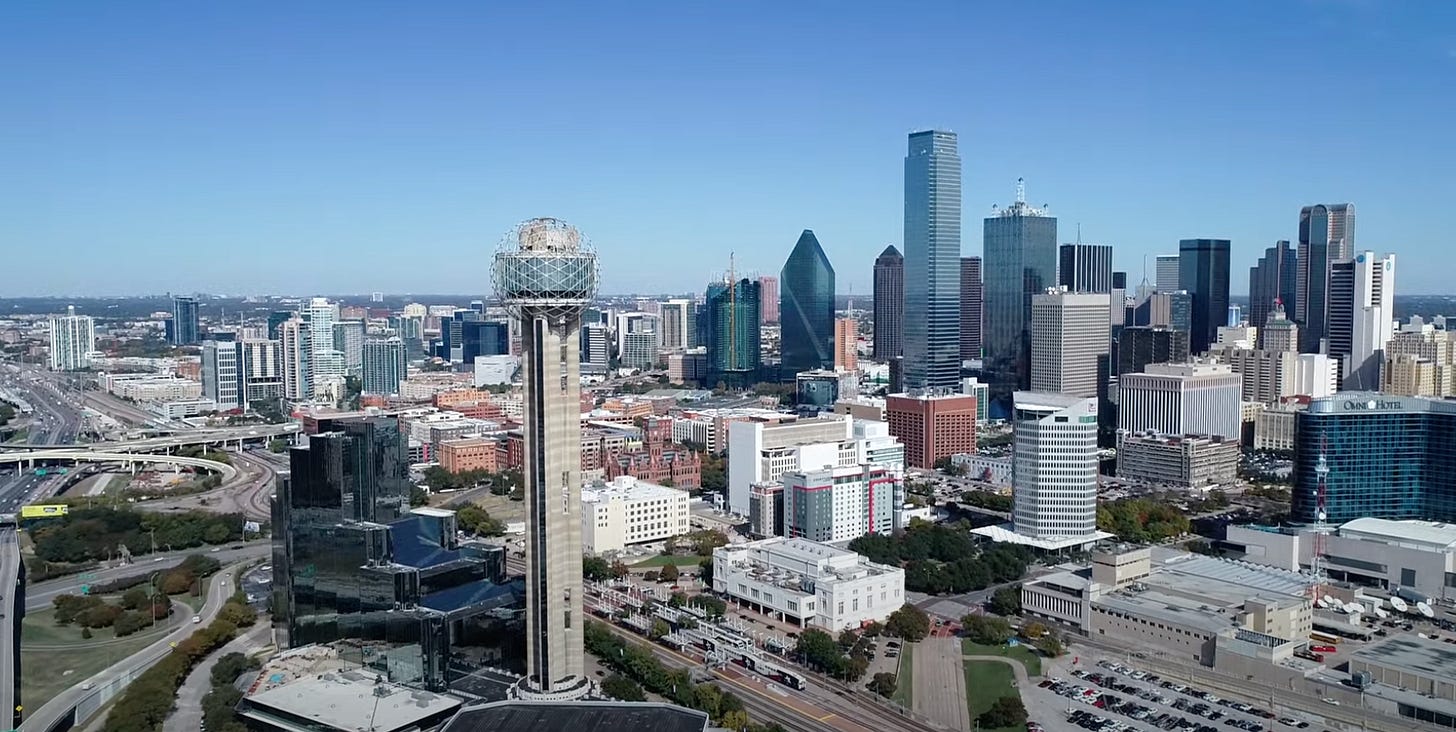 Dallas is a hard city to evoke with one simple design. In general, it’s a place that fits within that category of prairie cities saddled with parking lot sprawl1 rather than walkability. You basically have to have a car if you’re here for more than a day, and even that is just so you can get to the good restaurants without getting run over due to chronic lack of sidewalks.