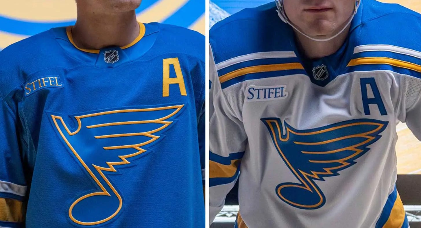 Take, for instance, a really beautiful update to the Blues’ sweaters this summer—marred with sponsorship, because money.