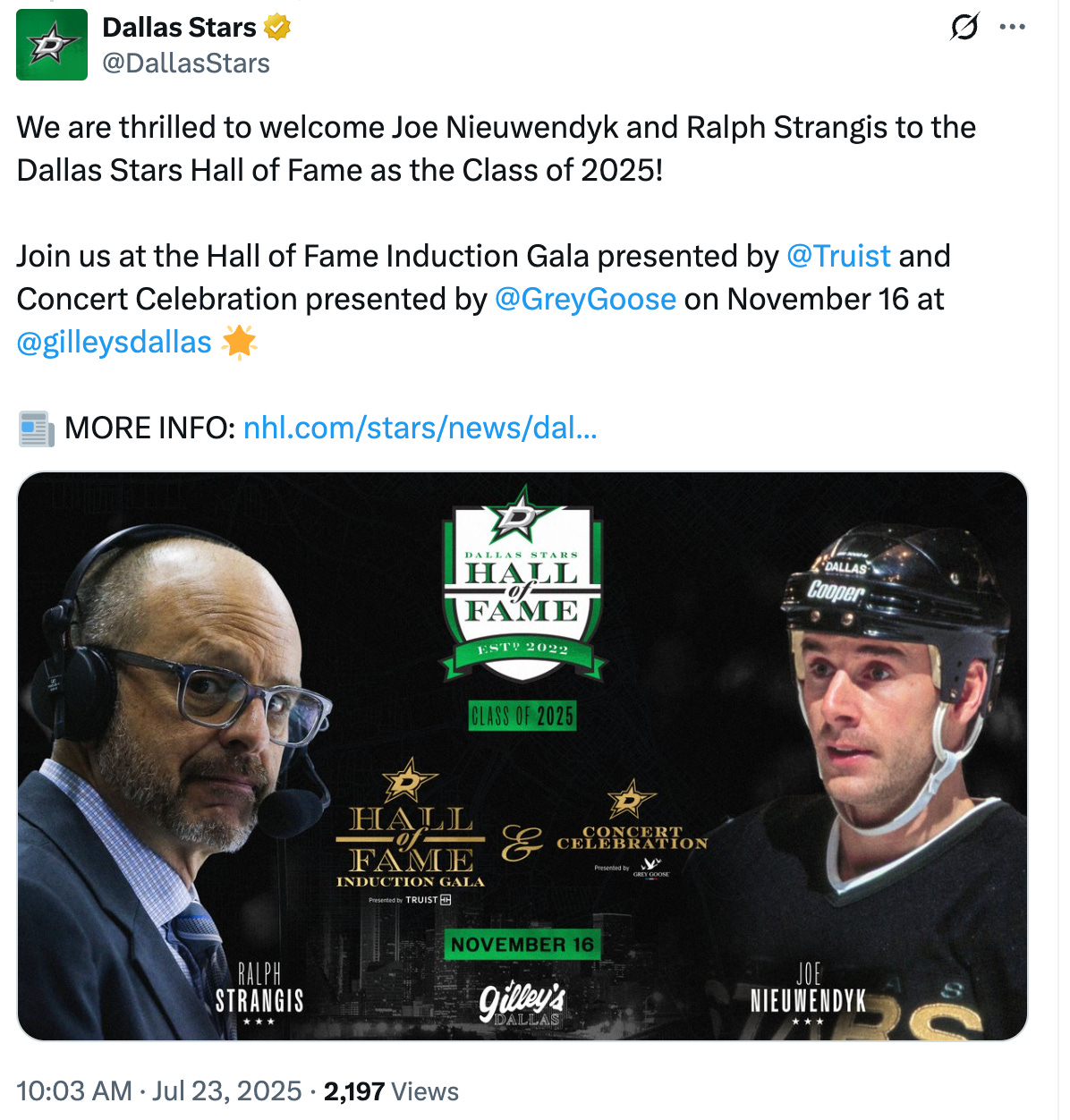 Wednesday Dallas Stars Roundup: Eyeball-Induced Speculation, Jersey Rankings, and Joe Nieuwendyk and Ralph Strangis to Enter Dallas Stars Hall of Fame
