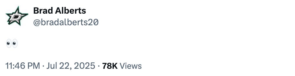 In the past, Alberts has posted this sort of thing as a precursor to Jim Nill’s GM of the Year award, Jake Oettinger’s extension, and other sorts of positive organizational news. This time around, the brief speculation centered on a few things, none of which turned out to be the right answer.