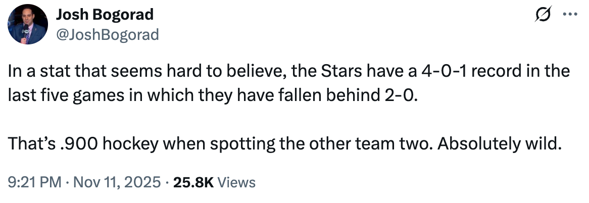 (It’s worth taking a step back, by the way, and looking around the league at all the teams who wish they were in the Stars’ shoes. Banking points is the name of the game in the early season, and the Stars have done that.)