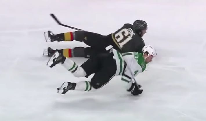 To supplement that knowledge, we can refer to a still image from that injury showing just how far Stone bends Heiskanen’s knee inwards: