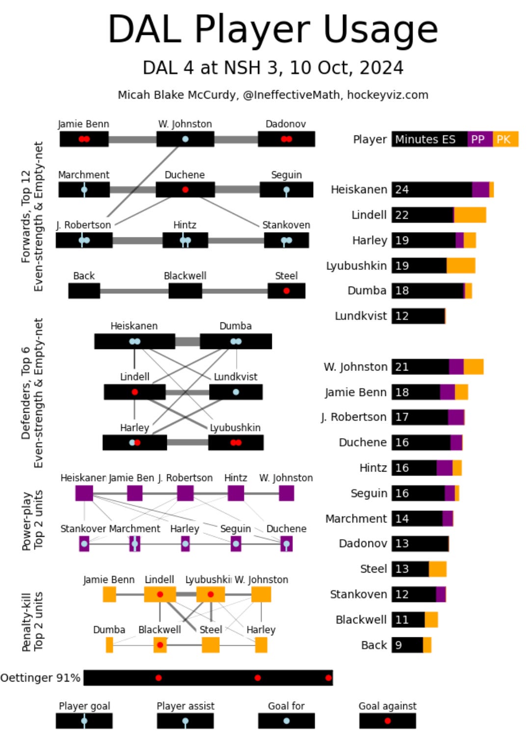 So that’s when Pete DeBoer went back to ol’ reliable: Johnston began the year centering Jamie Benn and Evgenii Dadonov once again, while Logan Stankoven got a chance to kick things off in style with Hintz and Jason Robertson on the…third line.