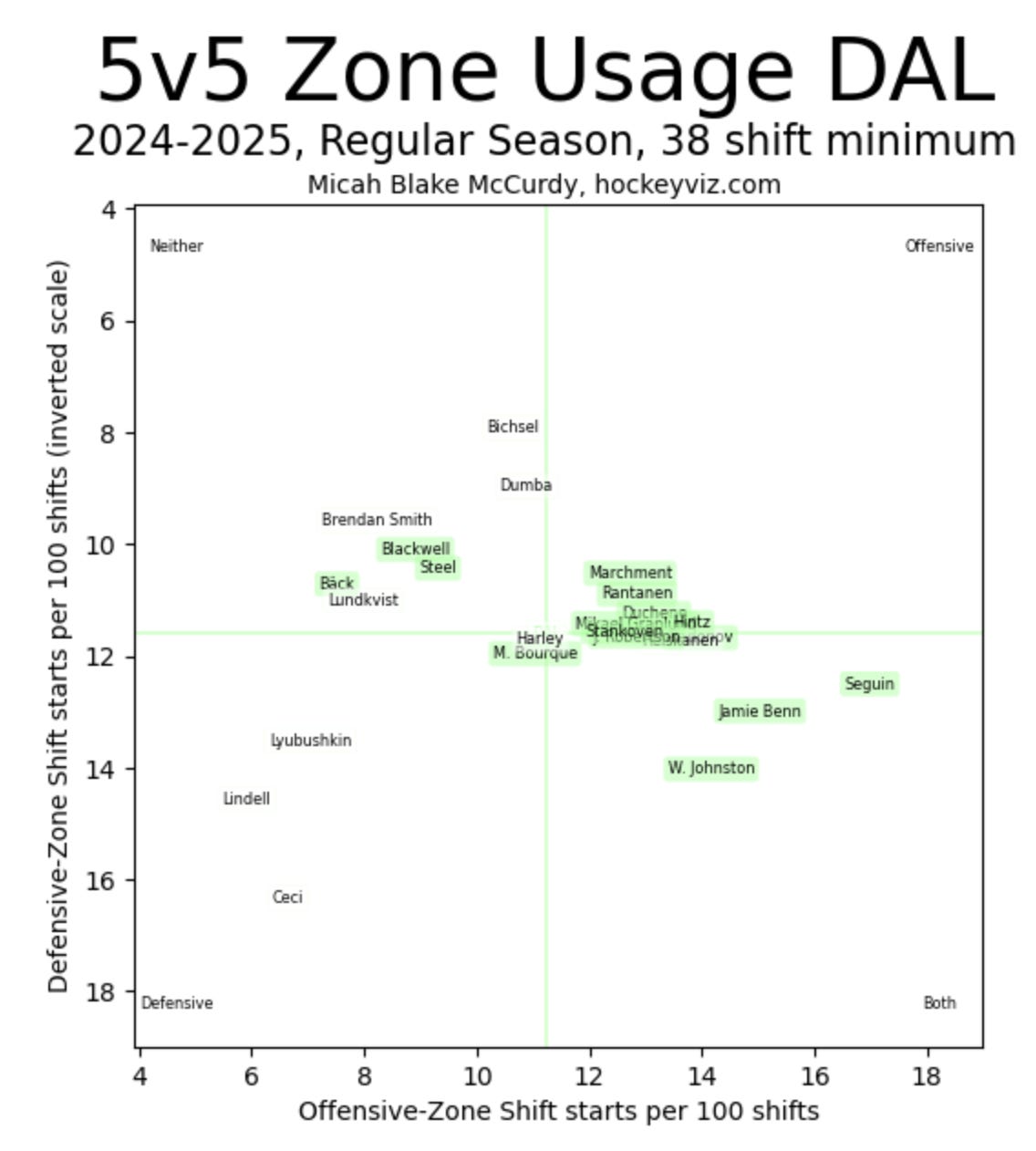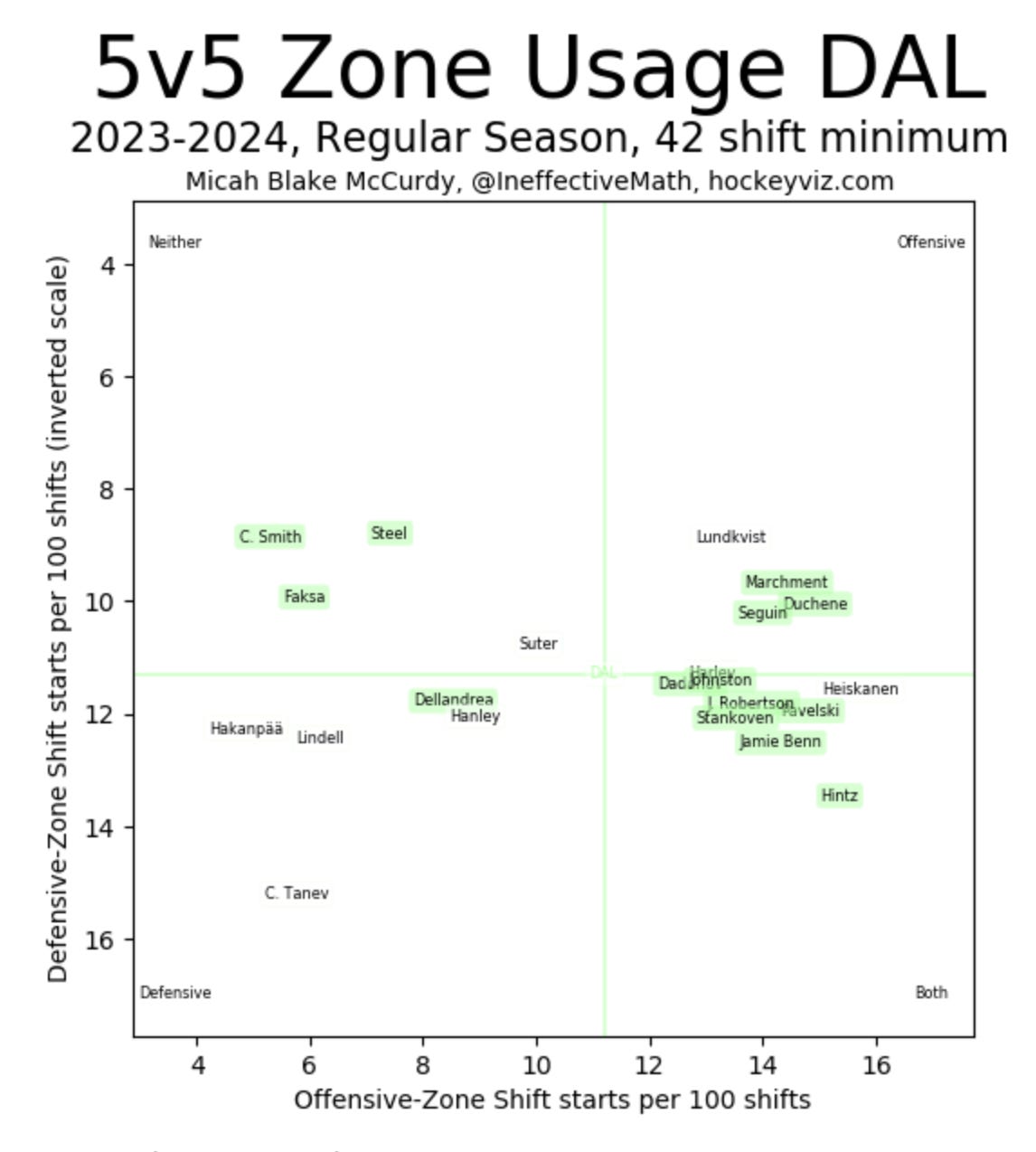 All this talk about zone deployment is something to be careful about, though. You should want your team’s best players to play the most minutes, and that includes defensive zone starts, too. It’s not a bad thing for great players like Hintz or Johnston to be on the ice, no matter what part of it they’re on.