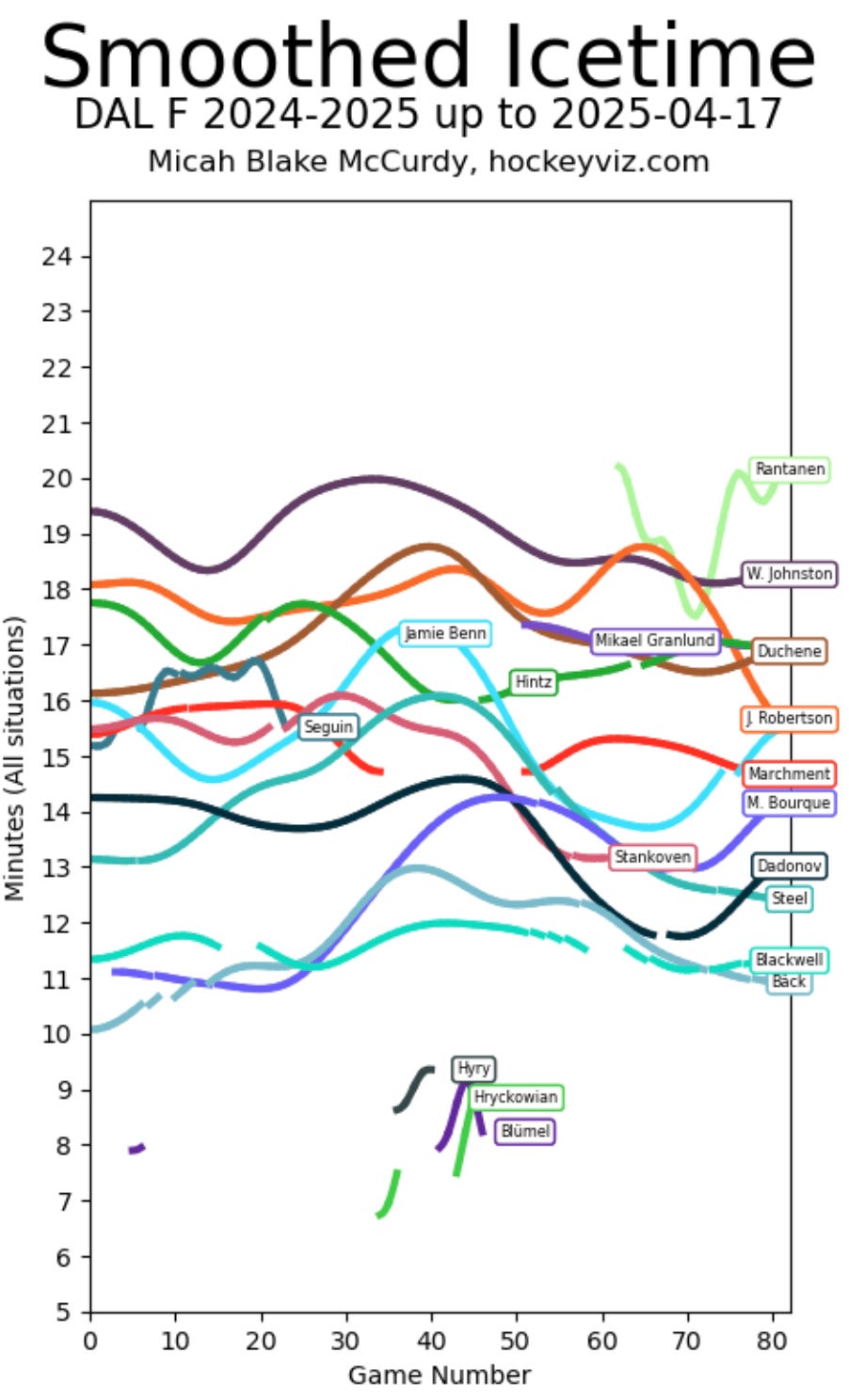 Johnston would end up playing eight games with Duchene and Robertson around the turn of the calendar, and to some success. But eventually, Mikael Granlund arrived a few weeks before Mikko Rantanen. And with the arrival of one of the best right wingers in the NHL, the opportunity for Johnston to jump on next to Hintz and Robertson was no longer available, and for good reason. Thus, Johnston’s role became that of a rotating pillar rather than a situational wing weapon. Also, he played with Jamie Benn a lot.