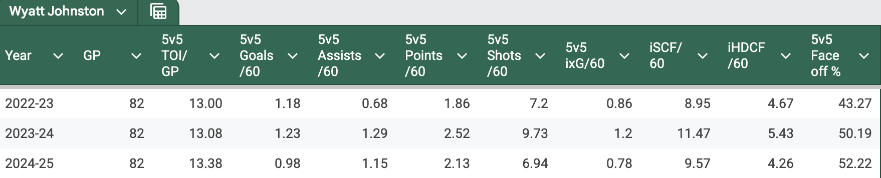 This year, Johnston will be playing for an NHL head coach who is not Pete DeBoer for the first time in his career. NHL coaches will surely see things I won’t think of in July, because they are paid millions of dollars to do that, but the most likely thing in a vacuum seems like Johnston would be viewed as one of the Stars’ best three centers along with Duchene and Hintz. That means you have to decide on who gets the offensive-zone starts, and who is going to be tasked with the tougher defensive work.