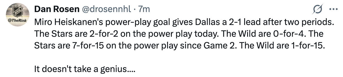 It wound up being an utterly dominant second period for Dallas, outshooting the Wild 17-4. And after going 2-for-2 on the power play, Dallas put Minnesota in the unenviable position of having just 20 minutes in which to erase a deficit, lest they go down 3-1 in the series.