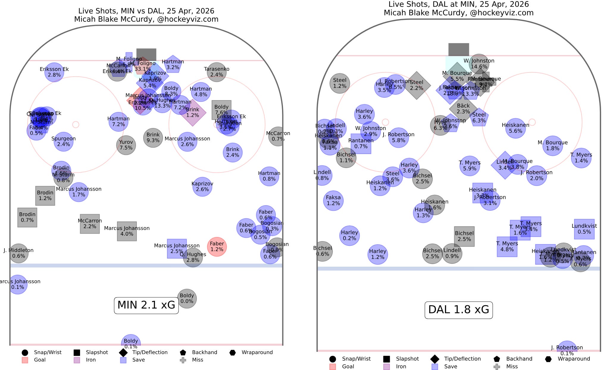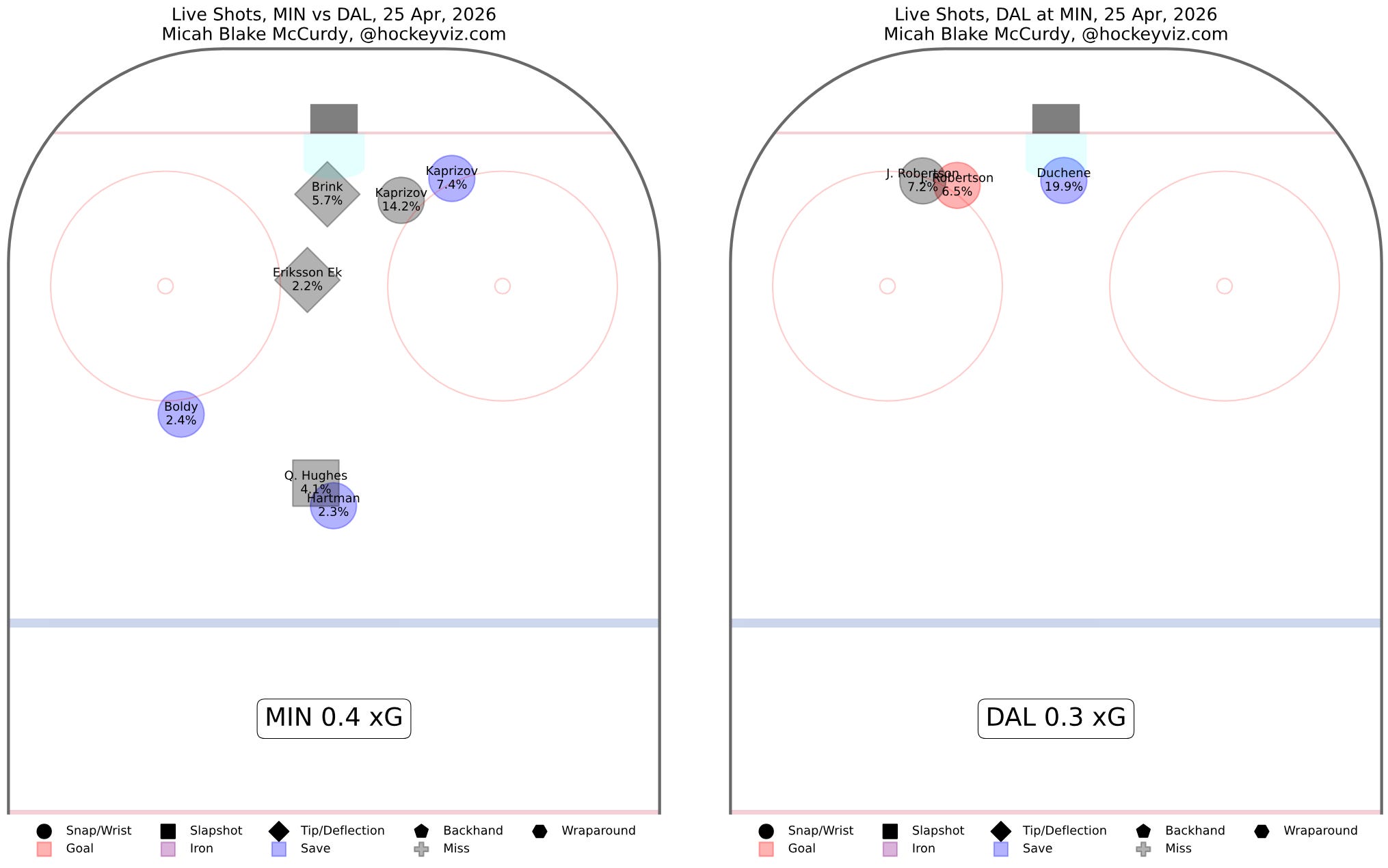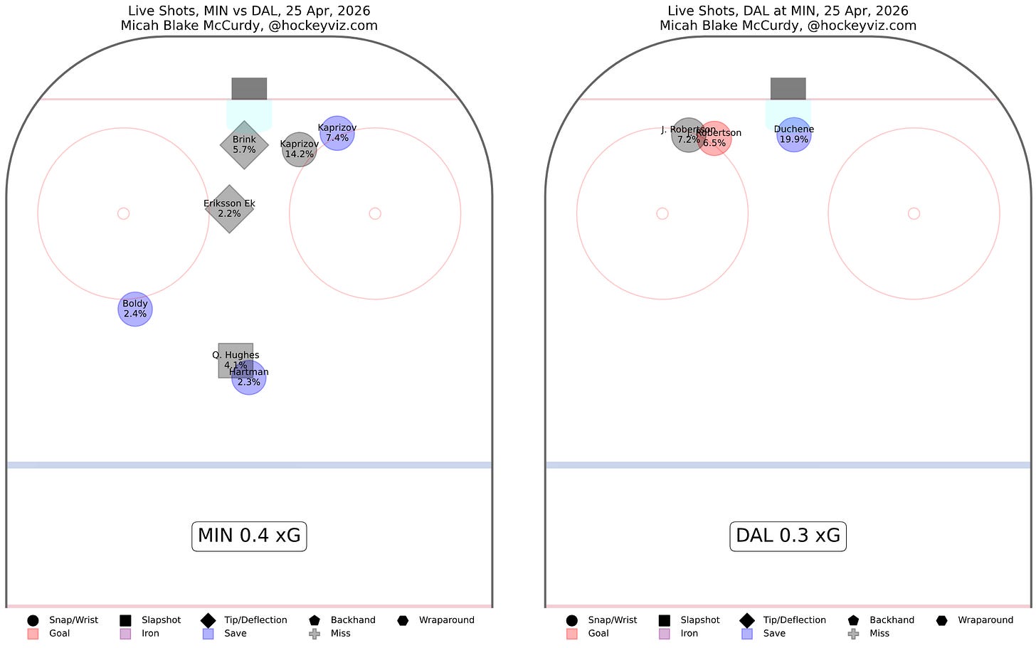 Minnesota will make much of the fact that they once again outscored Dallas handily at even-strength. Goals at 5v5 are 9-3 to the Wild so far in the series, and while Dallas once again didn’t get outplayed at evens tonight—shots were 45-43 for the Stars, and xG/scoring chances were similarly close—they did once again get outscored. Eventually, the results start to speak more loudly than the process, and Dallas is facing the reality of those results with the series tied 2-2.