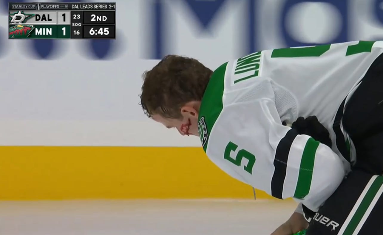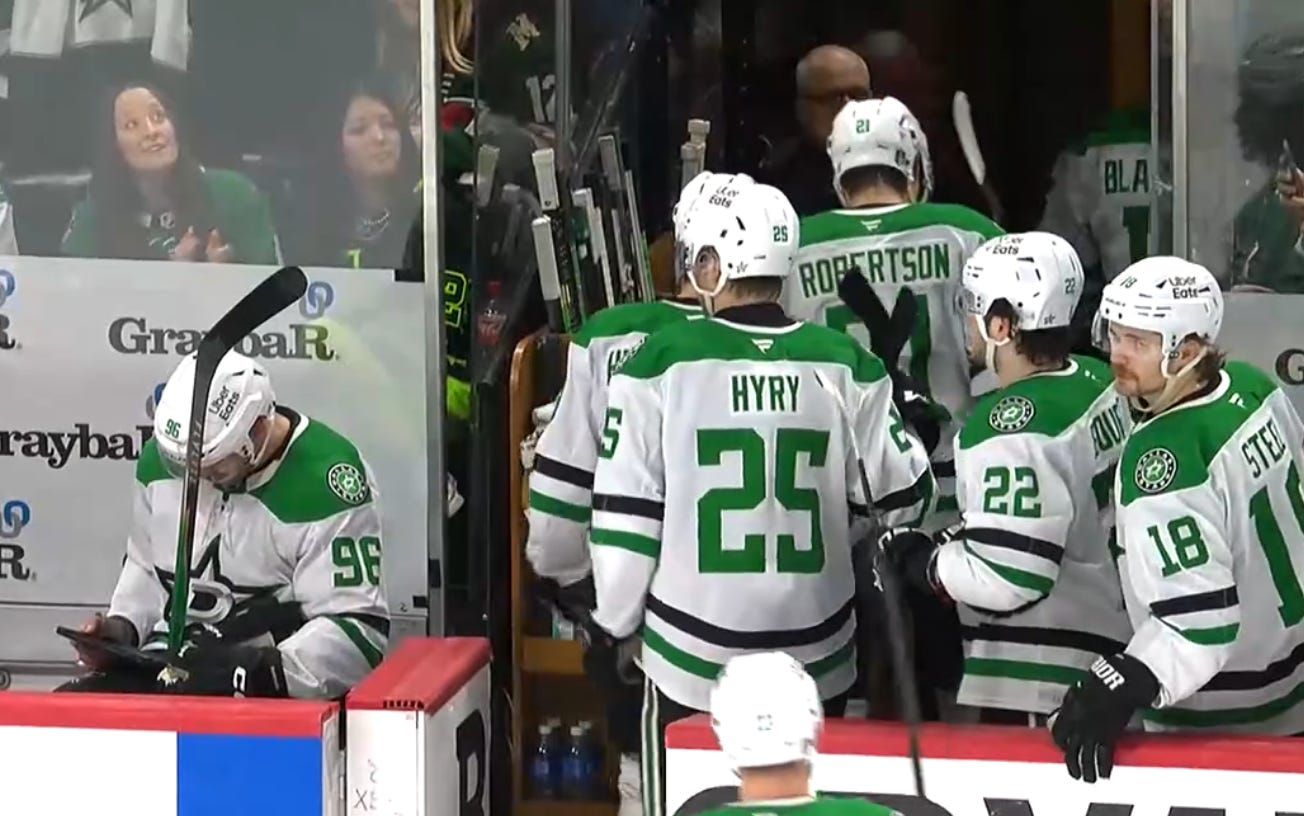 Going down to five defensemen halfway through the game could’ve been a galvanizing moment, had the Stars hung onto their 2-1 lead in the third period. Instead, the cost of asking players to play higher in the lineup became more apparent as the game wore on. The Stars’ third pairing was asked to play a ton, and their struggles to beat the Minnesota pressure led to tons of momentum in the wrong direction. Nils Lundkvist has become very important, but it’s unfortunate that it took this game to demonstrate just how important.