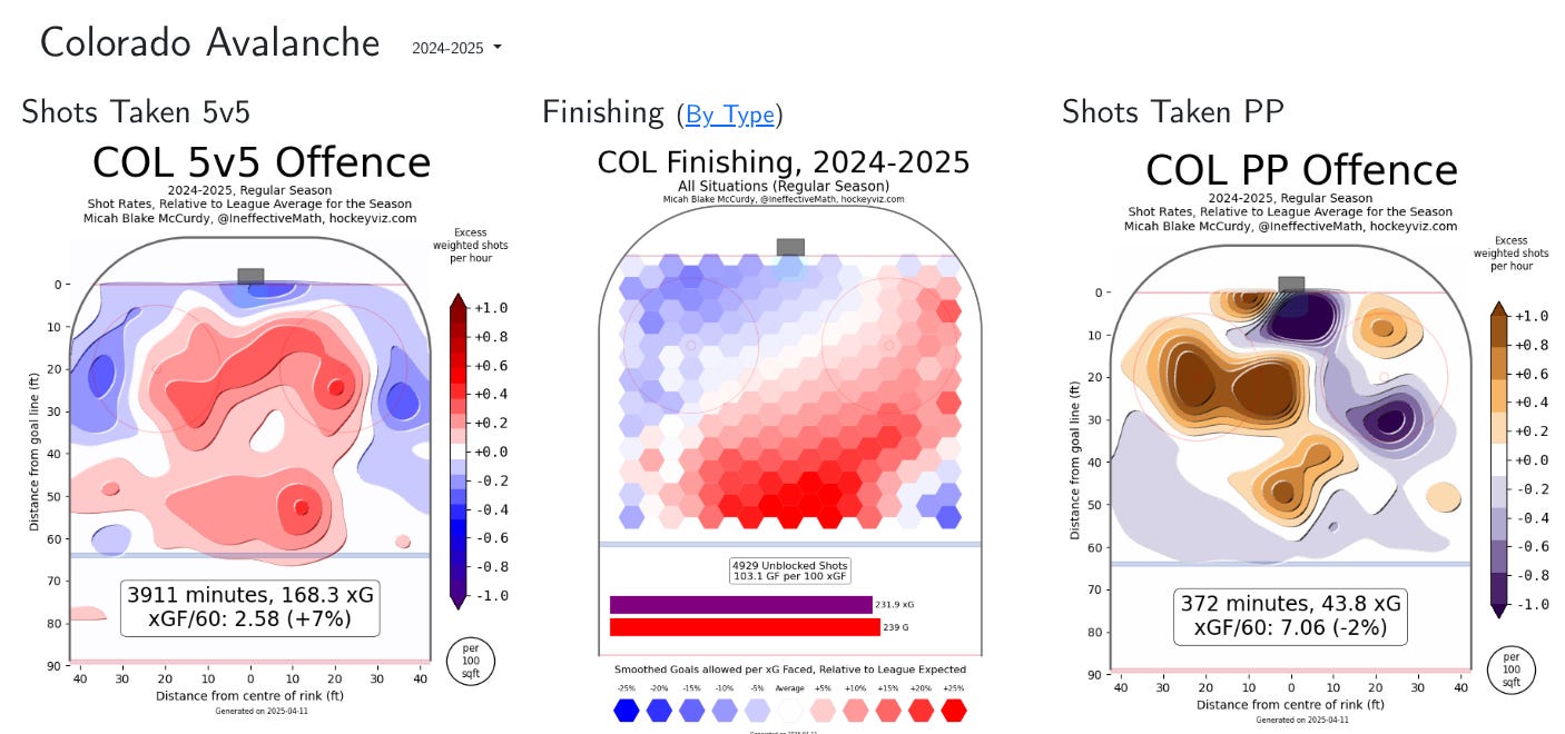 Here’s this year’s Colorado team. Click on the picture if you wanna dig in, but note that their power play offense is -2%, and how their Finishing is nearly dead-even with their expected goals.